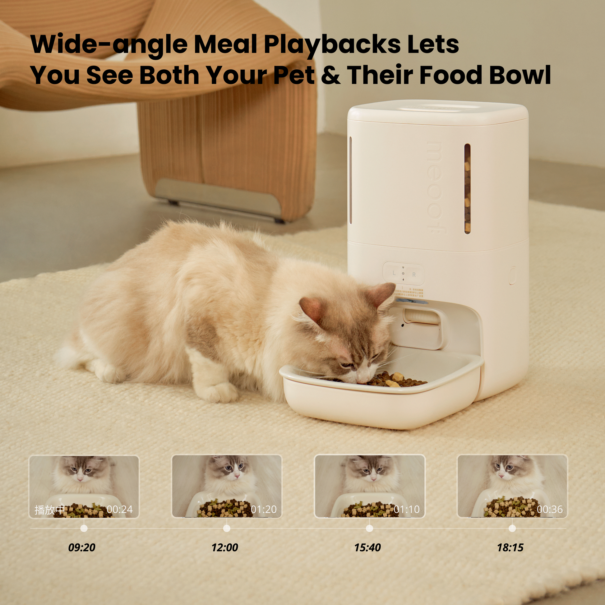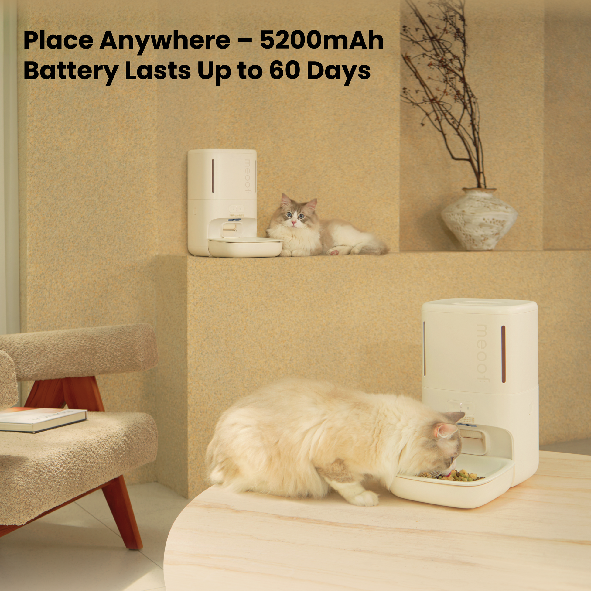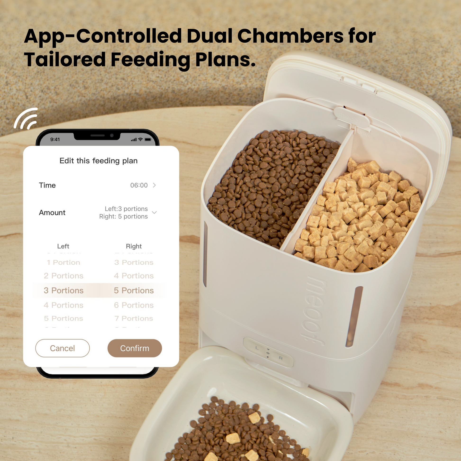 Control your cat's feeding schedule with ease using our App-controlled Smart Cat Feeder. This innovative automatic pet feeder connects to your Wi-Fi, allowing you to program and monitor your pet's meals from anywhere at any time through the meoof app on your phone. With our smart app, you have the flexibility to customize the feeding plan or simply click the feeding button to feed your pet from wherever you are. You can also check the feeding records to ensure that your beloved cat or dog has been fed on a set schedule, all controlled conveniently through an easy to use smartphone app. Plus, multiple family members can control the smart cat feeder from their own smartphones, making it a versatile and user-friendly solution.