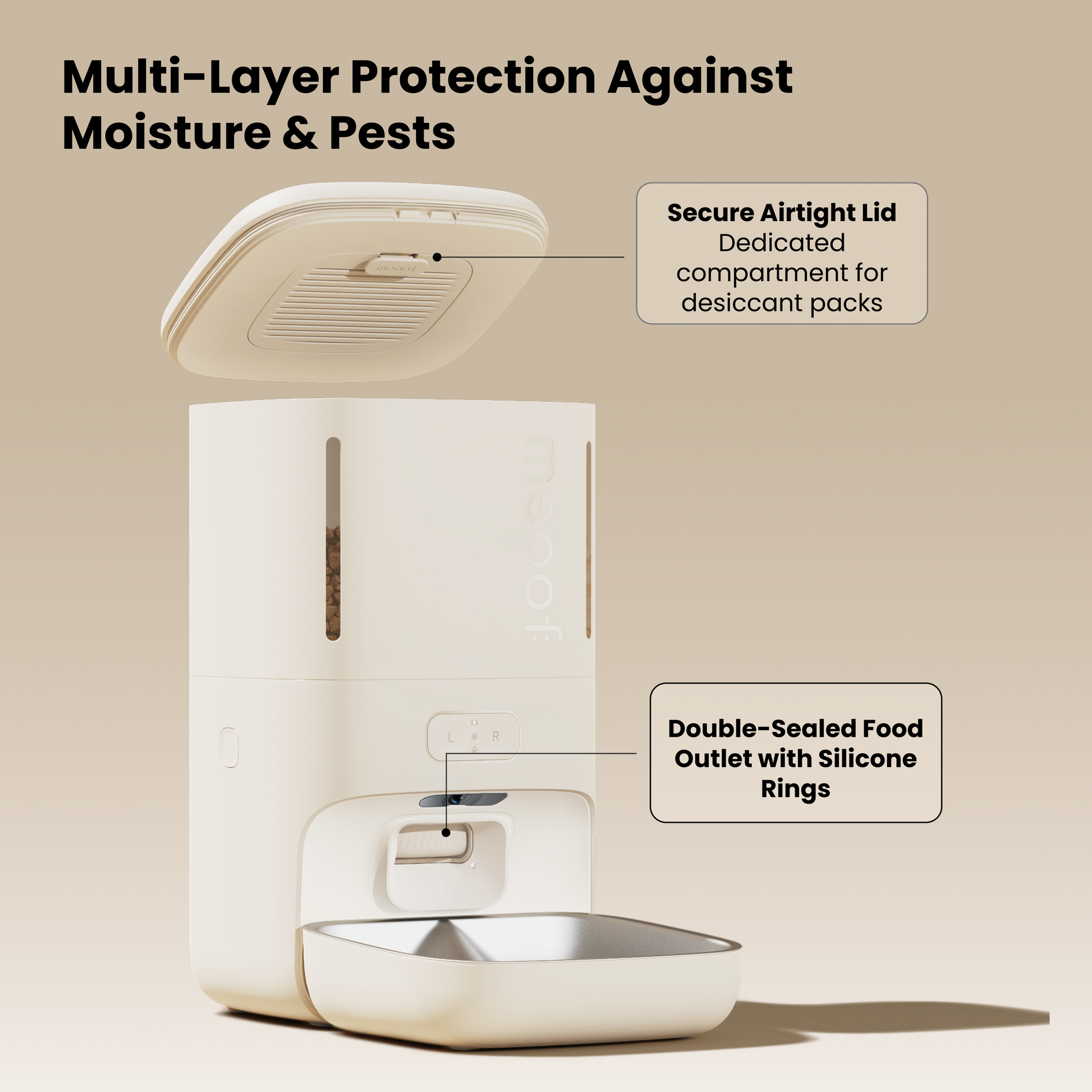 Experience freshness in every bite with our automatic cat food dispenser. This feeder is designed with a built-in desiccant bag and sealed strips, ensuring that the food remains fresh. The no-gap design prevents air exposure, maintaining the quality of the food for your furry family member. Additionally, the food-grade stainless steel bowl provides a healthier feeding experience, promoting the well-being of your pet.